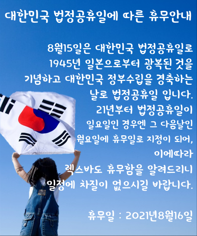21년8월16일 광복절 대체 휴무 안내 페이지 정보 작성자 관리자 댓글 0건 조회 11,648회 작성일 21-08-11 15:01 목록 본문 '21년부터 법정공휴일이 일요일인 경우에는 월요일에 대체 공휴일로 지정이 되어 쉬게 되었습니다.원래 21년에는 법정공휴일이 30인 이상 사업장에만 해당이 되어 렉스바는 대체휴무일과 관계없이 근로일이었지만 대표이사의 재량으로 인하여대체휴무로 지정하였습니다. 이전글'21년 기술임치2건 연장완료 21.08.11 다음글'21년 ISO인증 연장 완료 21.07.28